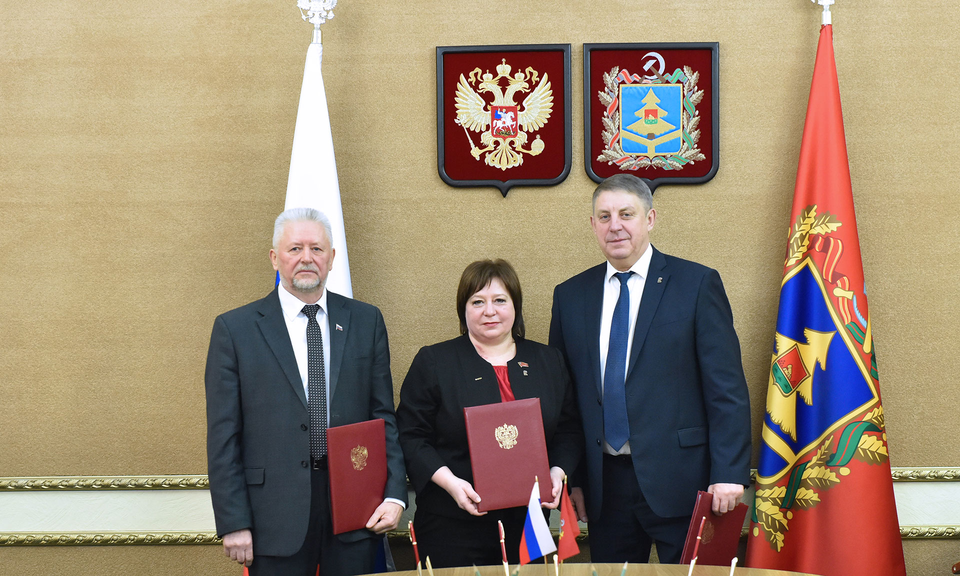 Соглашение подписали Губернатор Брянской области Александр Богомаз, председатель Федерации профсоюзов Брянской области Ольга Полякова, генеральный директор Брянской областной Ассоциации промышленников и предпринимателей — Регионального объединения работодателей Владимир Ивченков.