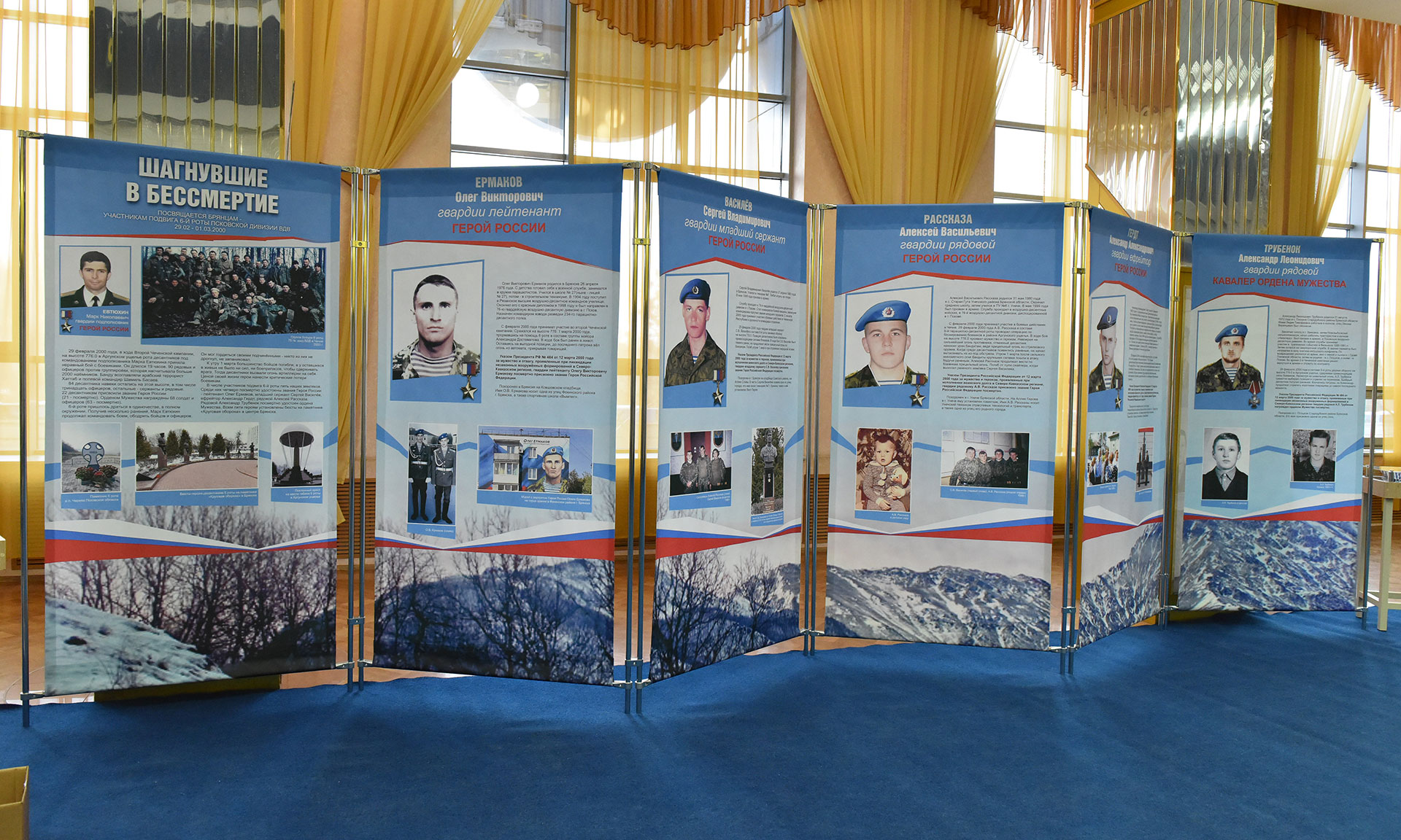 В фойе ДДЮТ им. Ю. А. Гагарина расположилась тематическая выставка «Шагнувшие в бессмертие. Подвиг 6 роты.», посвященная уроженцам Брянской области — участникам 6 роты Псковской дивизии ВДВ. В 10 витринах были представлены подлинные вещи героев из фондов Брянского государственного краеведческого музея и школьных музеев. На мольбертах установлены портреты героев, выполненные брянскими художниками — членами Союза художников России. Выставка оформлена стендами с информацией о подвигах брянских воинов — участников 6 роты Псковской дивизии ВДВ.