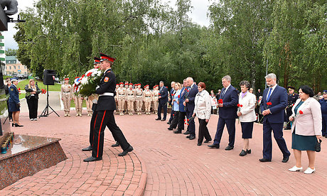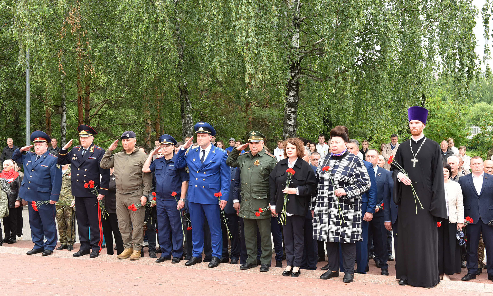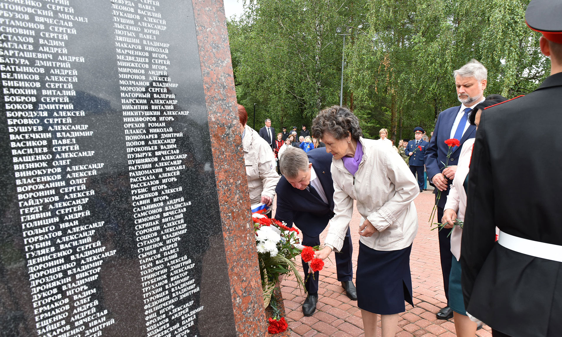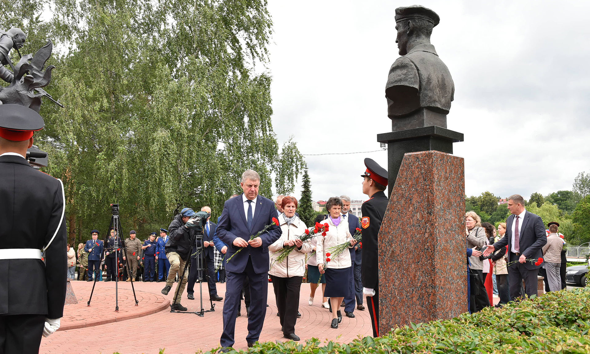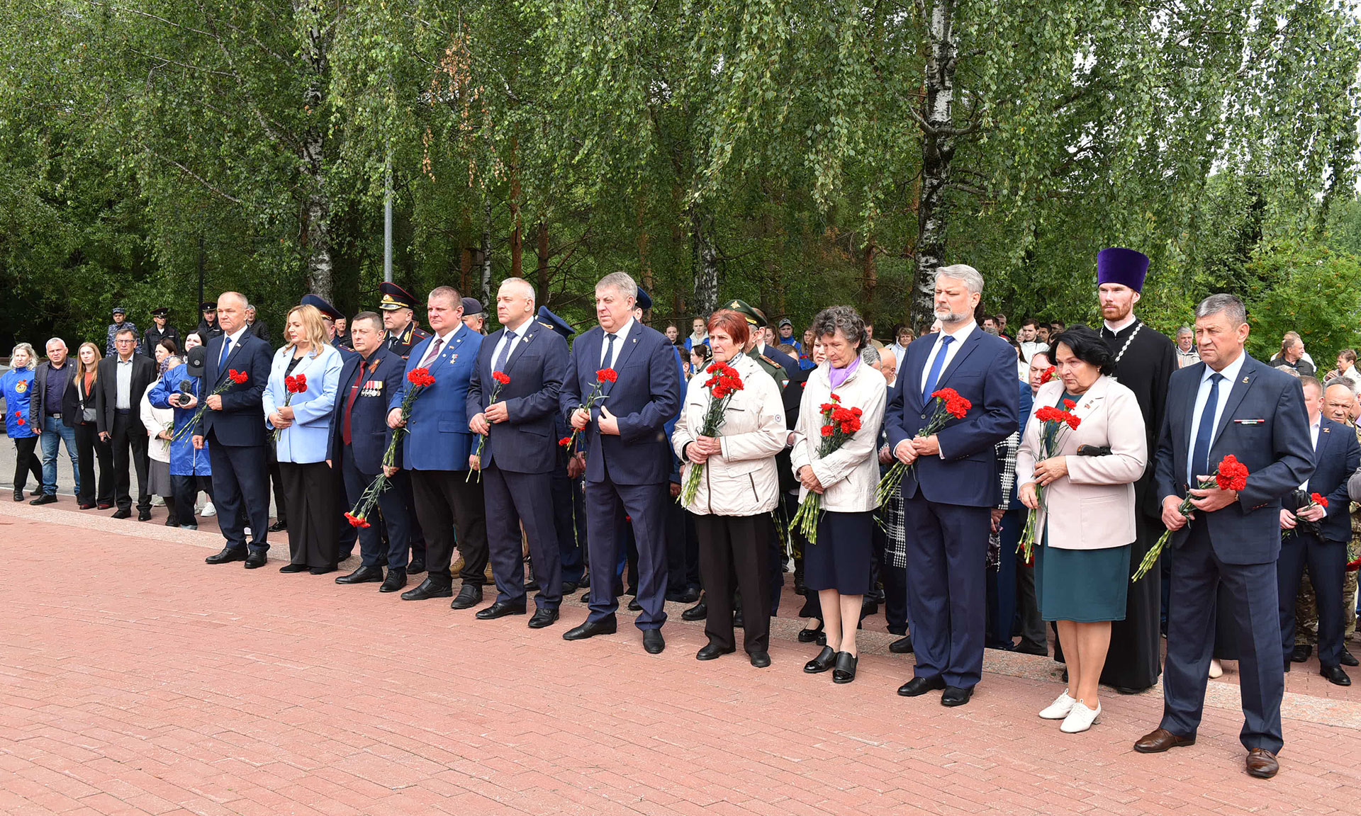 В знак памяти и благодарности цветы возложили Губернатор Брянской области Александр Богомаз, матери погибших Героев России Лидия Филипповна Ермакова и Галина Георгиевна Василева, мать погибшего в Сирии офицера Людмила Федоровна Журавлева, мать офицера, отдавшего свою жизнь в зоне проведения специальной военной операции Марина Николаевна Седнева, председатель Брянской областной Думы Валентин Суббот, главный федеральный инспектор по Брянской области Андрей Дьячук, Герой Российской Федерации Александр Постоялко, депутат Государственной Думы Федерального Собрания Российской Федерации Николай Щеглов, руководитель Брянского регионального отделения Общероссийской общественной организации содействия в представлении и защите прав и интересов ветеранов боевых действий «Ветераны боевых действий России» Вячеслав Губанов, участник специальной военной операции, участник президентской кадровой программы «Время героев», кавалер трех орденов Мужества, подполковник Евгений Вылцан, руководители судебных органов Брянской области, правоохранительных органов и силовых структур Брянской области, заместители Губернатора Брянской области, руководители города Брянска, председатели комитетов Брянской областной Думы, руководители и члены общественных организаций, ветераны Вооруженных сил, участники специальной военной операции, члены семей погибших защитников Отечества, члены общественных организаций, военно-патриотических клубов.