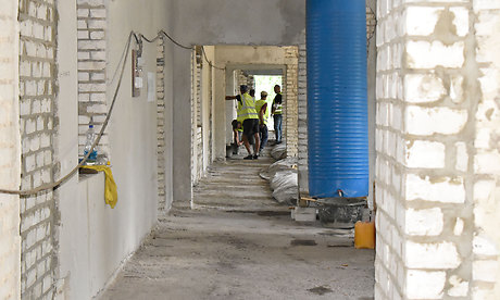 Инфекционная больница, которая не работала, это было разрушенное здание. Все, что здесь остается от прежнего здания,- это стены. Сейчас уже завершены работы по капитальному ремонту кровли над тремя зданиями: детских поликлиники и больницы, а также будущего инфекционного отделения. Также уже произведена замена оконных блоков и отделка откосов, продолжаются работы по монтажу вентилируемого фасада. В инфекционном отделении ведутся работы по заливке полов, приступили к монтажу перегородок.